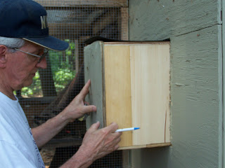 Wooohoooooooo! He built a little box into the wall of the pen so I can put a light inside it that climbing coons and bad weather cannot get to. All it takes is a couple of long